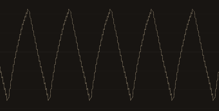 接著來看看 NES 的三角波。NES 採用的晶片 2A03 產生出來的三角波其實是階梯狀3,硬體內建長度 32 的波形查詢表,播放時會按照這個序列循環讀取出來。數數看是不是上升 16 階再下降 16 階?