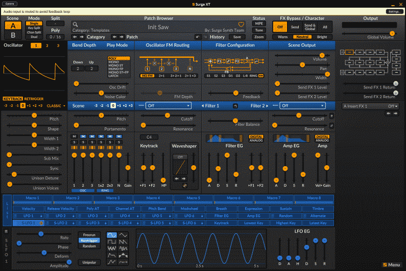 曾經嘗試用寫程式的方式來發出三角波的聲音,但發現這樣實在太痛苦了,決定不拿石頭砸自己腳。工欲善其事,必先利其器。找來 Surge XT 這款看起來功能強大的合成器軟體,幫助我們控制電腦發出聲音。試用了一陣子,可以快速產生各種基本聲波,而且還內建一堆 Patch 讓你實驗各種聲響。這軟體不僅不用花半毛錢,而且還開源,不幫忙推廣實在是對不起自己。